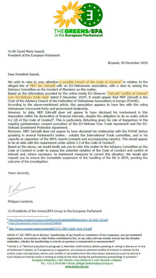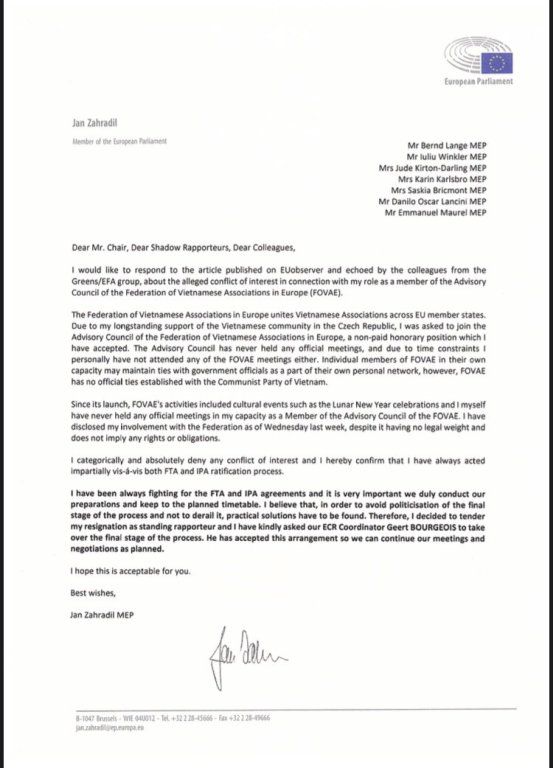 The letter, sent by Philippe Lamberts, one of the co-presidents of the Greens/European Free Alliance Group, cites a recently published article by the EU Observer which accuses Zahradil of a “conflict of interest” after it was revealed that Zahradil failed to disclose that he was chairman of the Advisory Council to the Federation of Overseas Vietnamese Associations in Europe (FOVAE).