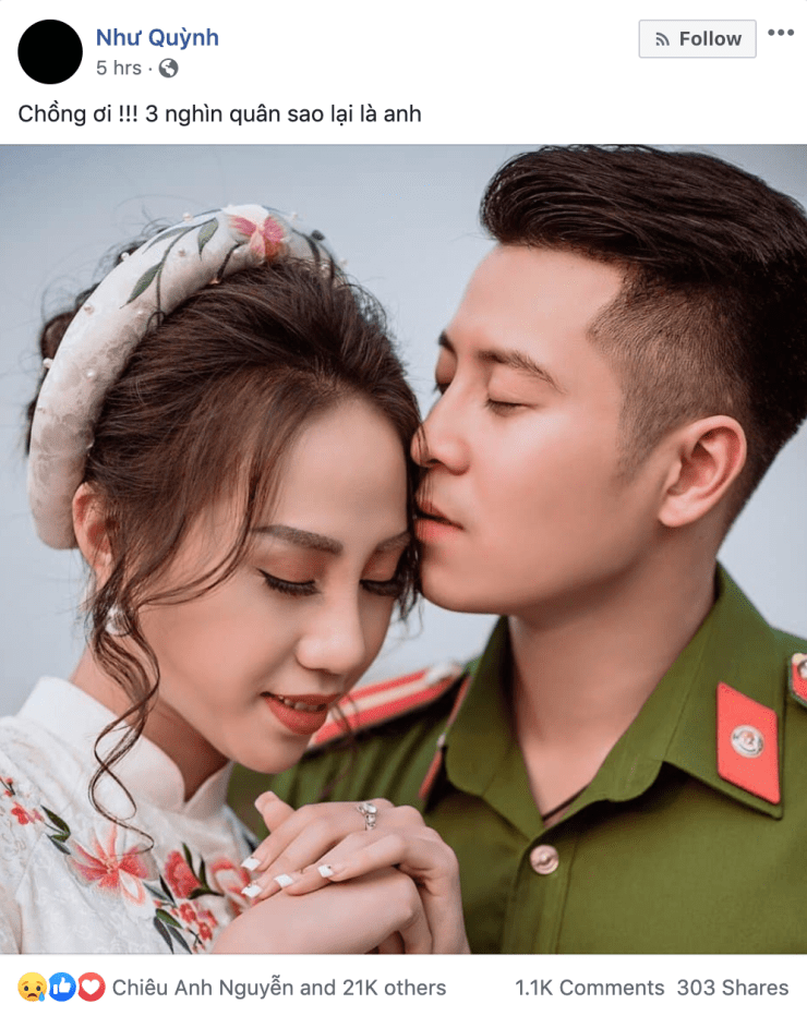 Images of one of the police officers killed in the clash have also begun circulating on social media, with those on both sides of the land dispute expressing sympathy. Nhu Quynh, whose 27-year old husband appears to have been involved at Dong Tam, inadvertently revealed in her caption that 3000 police officers were deployed. The image (screencaptured below) has since been taken down.