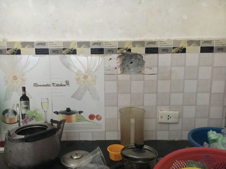 “Just stay still here, I will go downstairs and get you a wet cloth to help you breathe better.” That was my last sentence to my husband. The fumes were so heavy. I was going back to his side when someone took my arms and dragged me away. When I came back home, the room was covered in blood. Our home was shattered. Can you see this door jamb protruding out? A bullet is stuck in it.