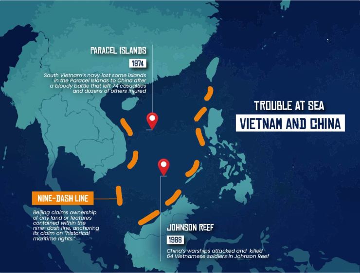 In 1988, China and Vietnam clashed in the South China Sea when China’s warships attacked and killed 64 Vietnamese soldiers and seized the Johnson Reef. Another battle in recent history was in 1974, when South Vietnam’s navy lost some islands in the Paracel Islands to China’s hands after a bloody battle that left 74 casualties and dozens of others injured. Skirmishes still break out between the two countries, something the Vietnamese frown on.