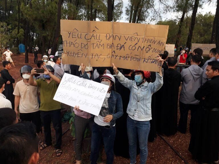 The land dispute at Thien An Abbey continued to escalate in August 2020. On August 10 and 11, a group of about 40 individuals organized a protest to speak out against Thien An Abbey for sitting on their and the government’s land. Protestors used large signs and loudspeakers to threaten and insult monks while standing on the disputed land. According to the abbey, the crowd’s organizers were cadres of the Thuy Bang Commune People’s Committee, along with a number of police, as well as cadres from social organizations such as the Women’s Association.