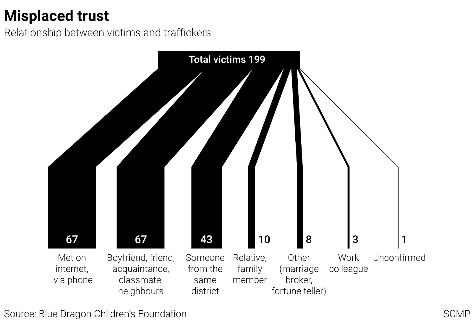 Following the data compiled by the Blue Dragon Foundation, forced marriage and domestic servitude accounted for the majority of all prosecuted cases. The victims, mostly women, are often lured and misled by false promises of well-paid job opportunities in foreign countries, but they are eventually forced into marriage with Chinese men.