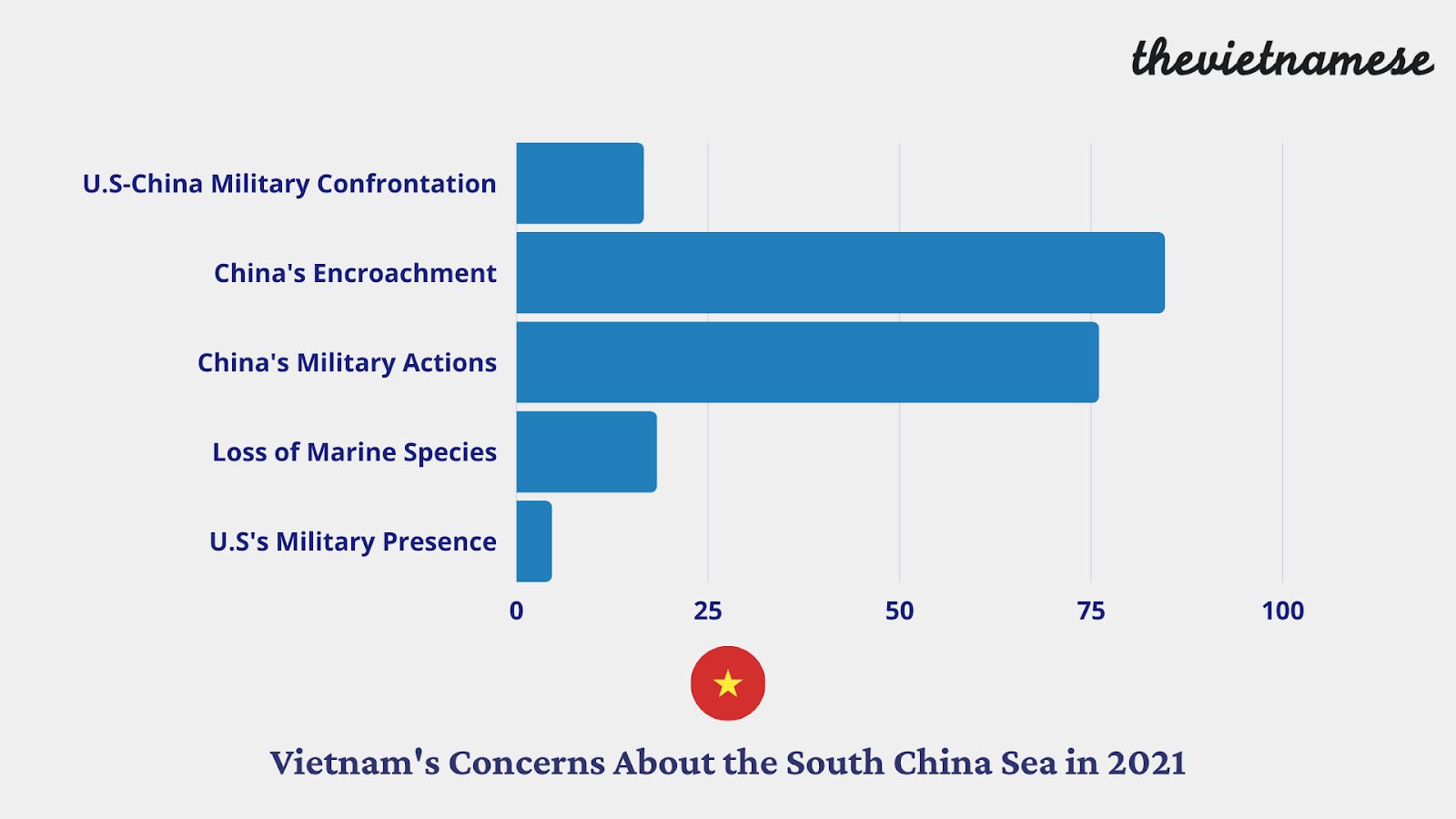 When it comes to the South China Sea, Vietnam also shows the most concern with China’s actions – its encroachment and military activities – rather than the US military presence or an escalation of the situation between the US and China.