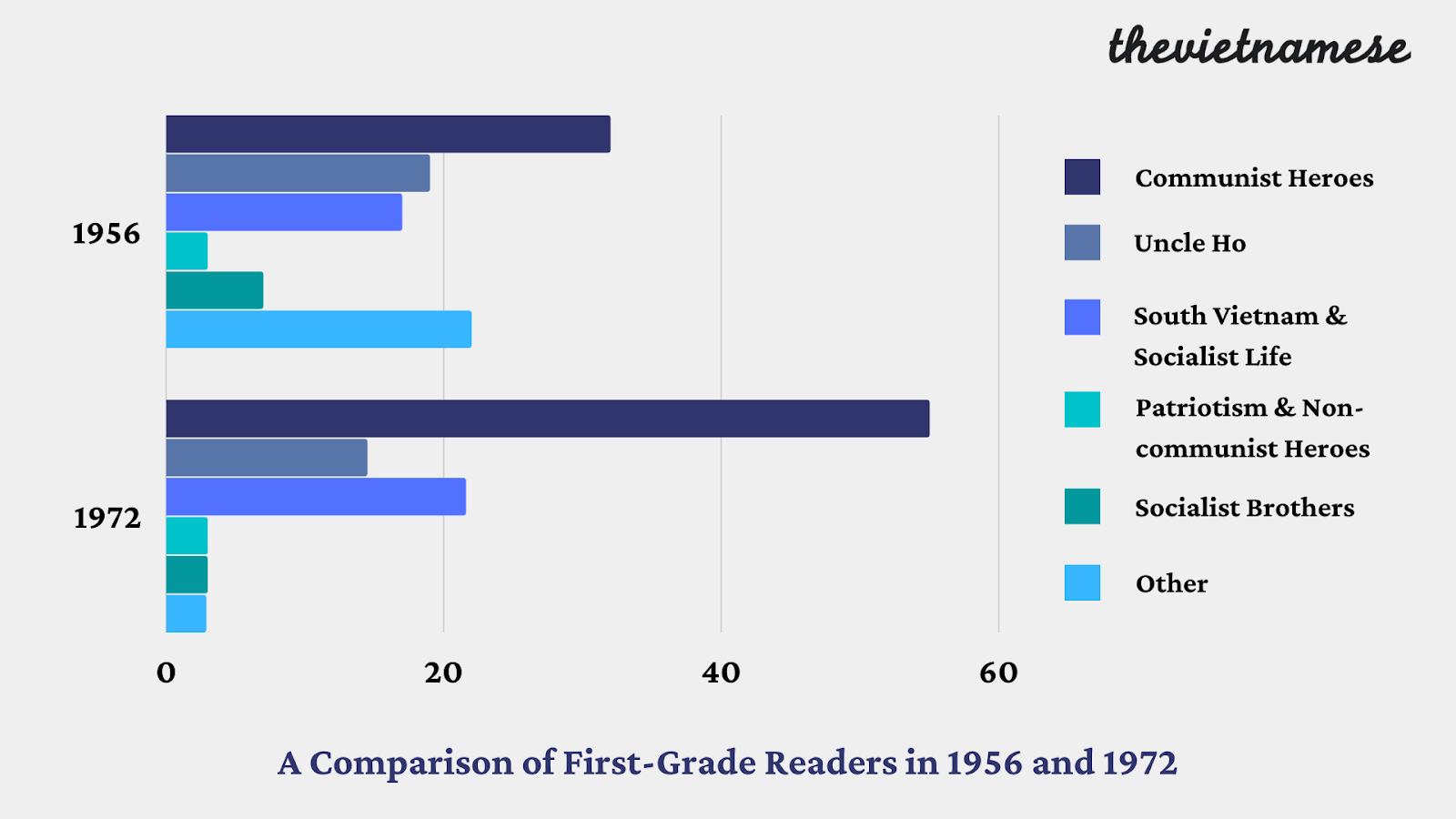 Firstly, there was significantly more content on communist heroes and less content on other socialist countries in the latter edition. This was due to the prolonged war, which produced more “heroes”, and because the VCP seemed to focus more on glorifying internal communist mobilization after the Sino-Soviet split. Additionally, these communist heroes were portrayed as both nationalist and communist – their struggle was seen as both contributing to the country and the international construction of communism worldwide.