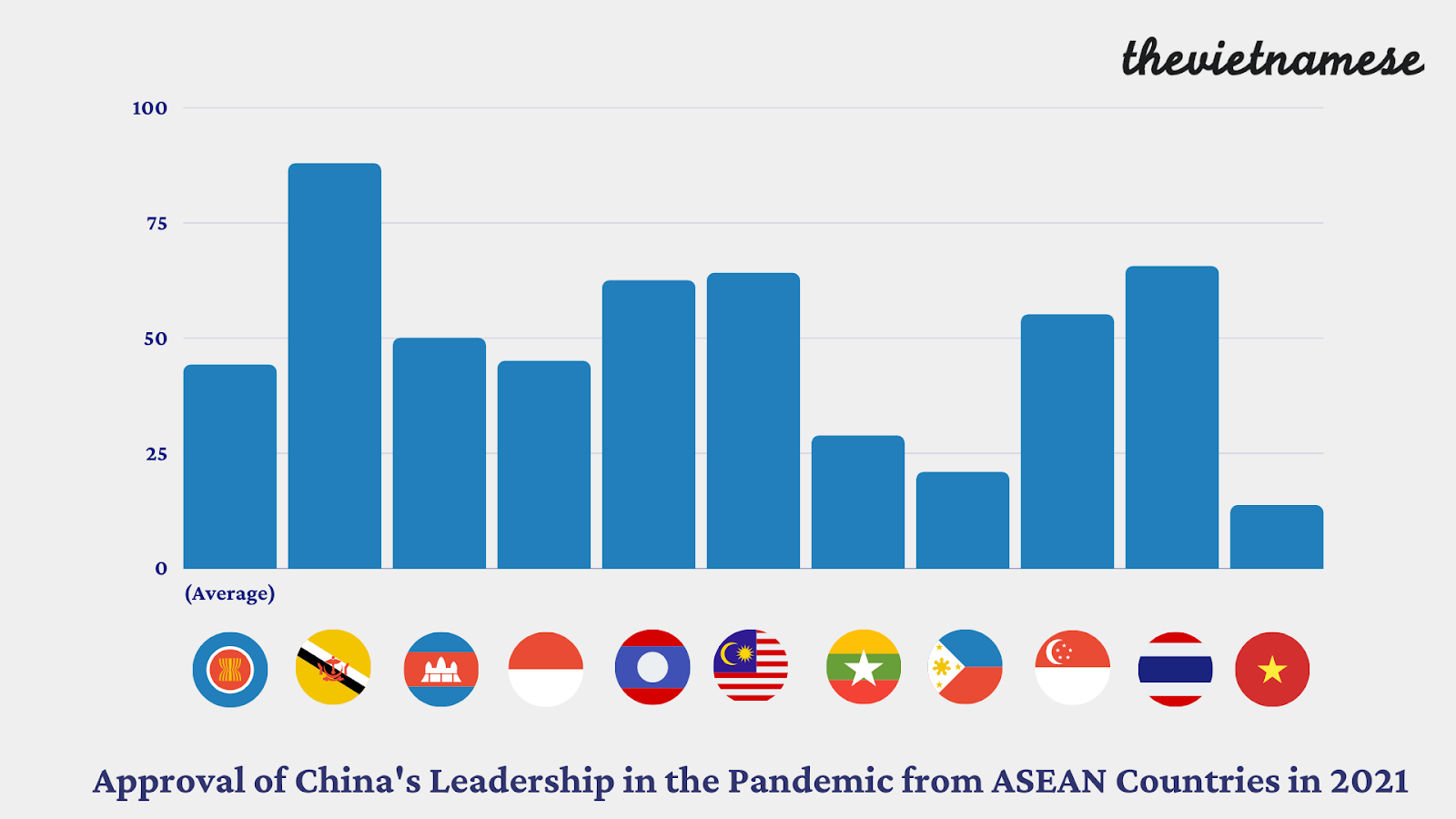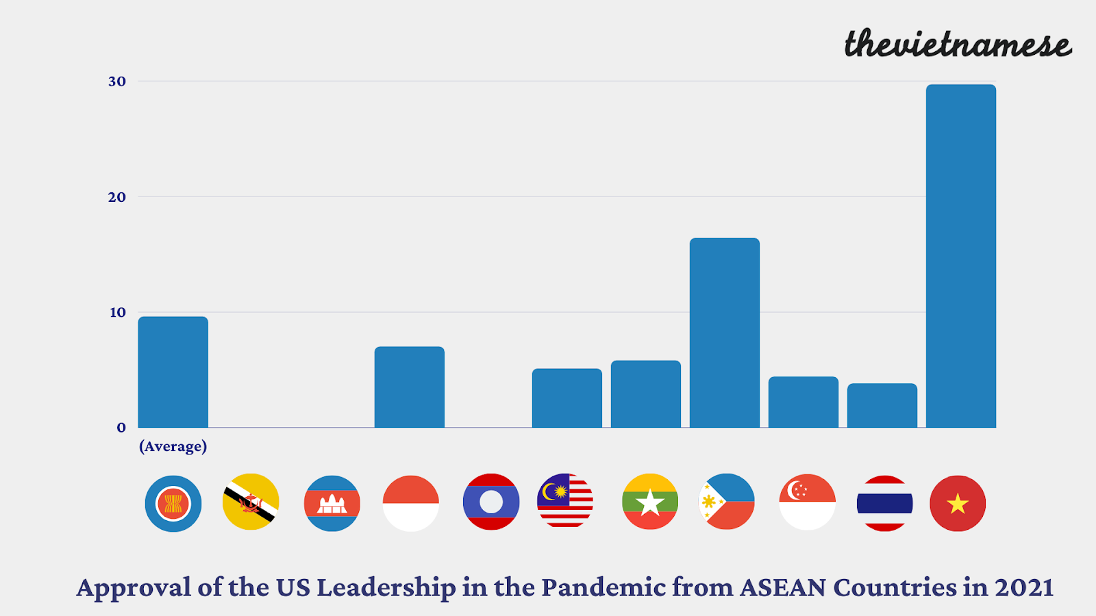 In a survey conducted by the ISEAS-Yusof Ishak Institute in 2021, individuals from Vietnam are the most disapproving of China’s leadership in the pandemic among 10 ASEAN countries, significantly more disapproving than others.[16] In contrast, Vietnam is the most approving of US leadership in the pandemic among these countries, much more so than the average ASEAN country.